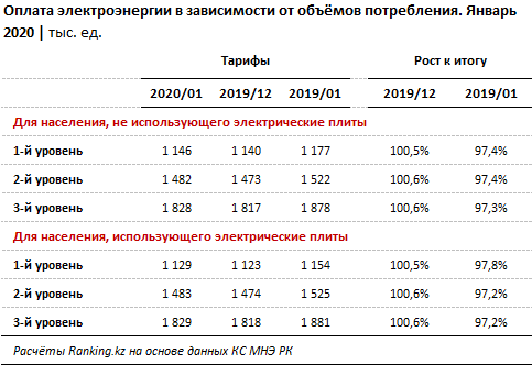 Так, тарифы первого уровня увеличились на 0,5%, до 1146 тенге за 100 кВт⋅ч для населения, не использующего электроплиты, и до 1129 тенге за 100 кВт⋅ч — для использующего.