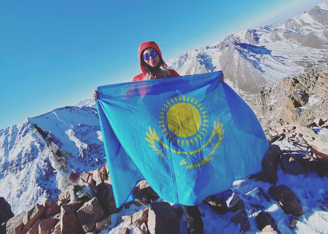 Альпинистская экипировка карагандинки выполнена в виде флага, а в зарубежные поездки она всегда везет казахстанский шоколад, которым угощает иностранцев.