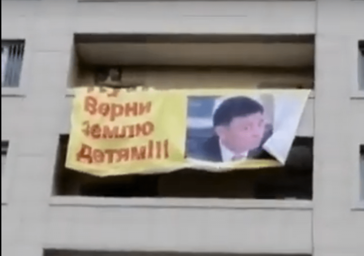 Чтобы привлечь внимание акимата жители вывесили на балконе плакат с изображением акима Нур-Султана Алтая Кульгинова и подписью "Верни землю детям".