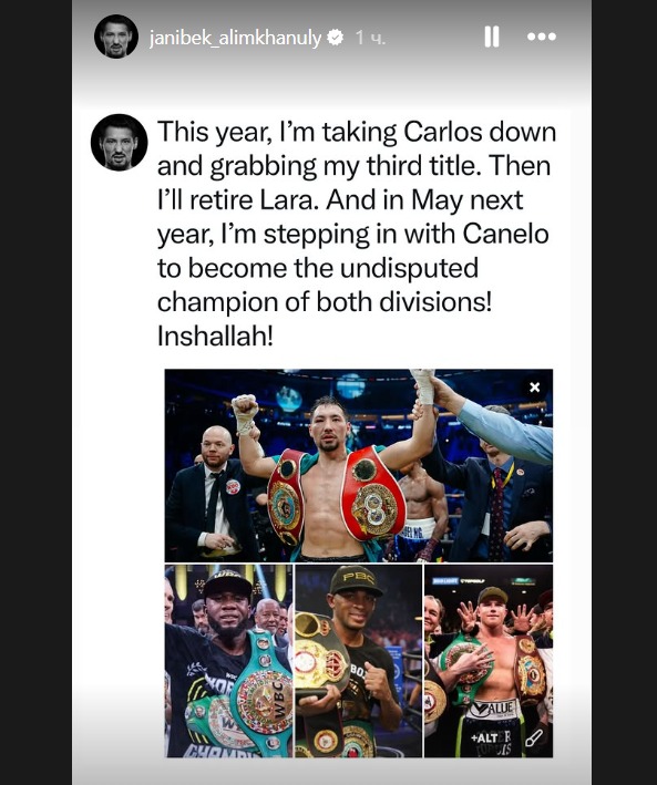 “В этом году я побеждаю Карлоса и забираю свой третий титул. Затем я отправлю на пенсию Лару. А в мае следующего года я выйду на ринг с “Канело”, чтобы стать абсолютным чемпионом обоих дивизионов”, – поделился в Instagramm-stories Жанибек Алимханулы.