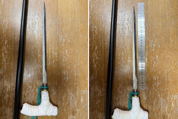 В ходе осмотра выяснилось, что она пыталась пронести в здание суда нож длинной 30 см, спрятанный в трости. Предмет, запрещенный к проносу, был изъят.