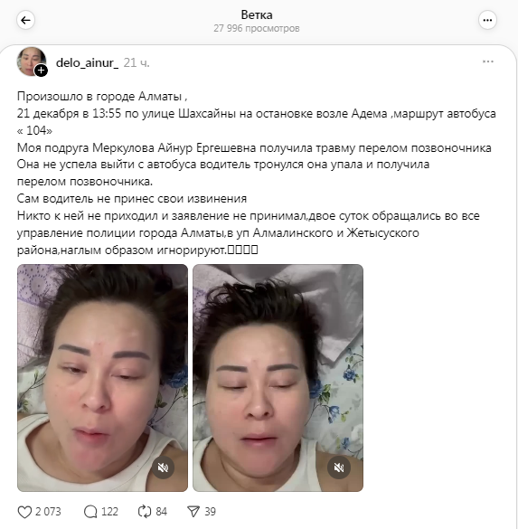 "21 декабря в 13:55 по улице Шахсайны на остановке возле “Адема” ,маршрут автобуса "104". Моя подруга Меркулова Айнур Ергешевна получила травму – перелом позвоночника. Она не успела выйти из автобуса, водитель тронулся, она упала и получила перелом позвоночника. Сам водитель не принес свои извинения. Никто к ней не приходил и заявление не принимал, двое суток обращались во все управления полиции города Алматы, в уп. Алмалинского и Жетысуского района, наглым образом игнорируют", — заявила автор.
