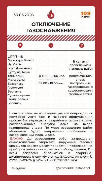 Как сообщили в Астанинском производственном филиале АО “QAZAQGAZ AIMAQ”, подача газа будет временно прекращена в понедельник, 30 марта 2026 года, с 09:00 до 18:00.