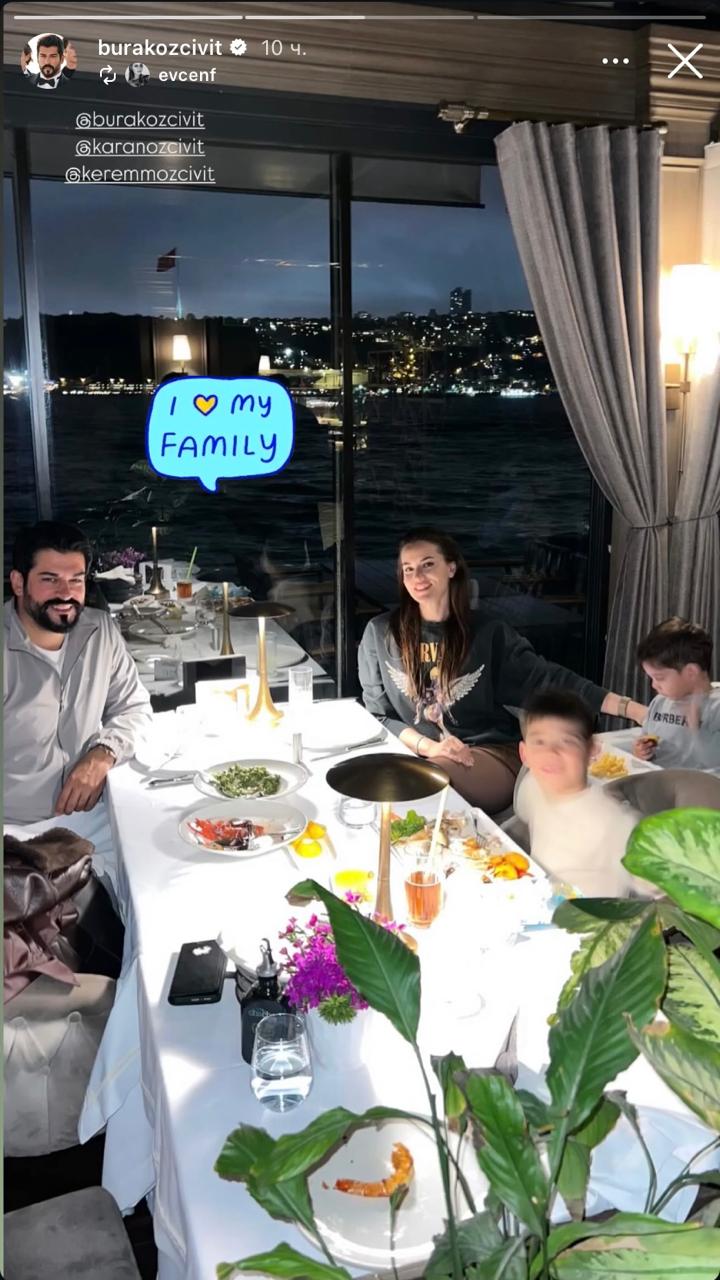 На фото – уютный вечер в ресторане с супругой Фахрие Эвджен и двумя сыновьями, Кераном и Керемом. Актер подписал снимок просто, но с душой: