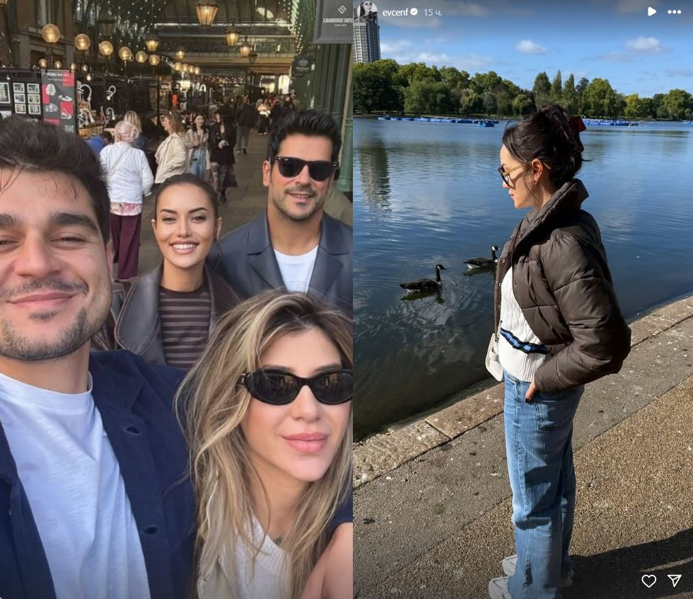 Фахрие опубликовала серию Instagram-stories, где позирует на фоне реки с уточками, а на других – с супругом Бураком и еще одной парой.